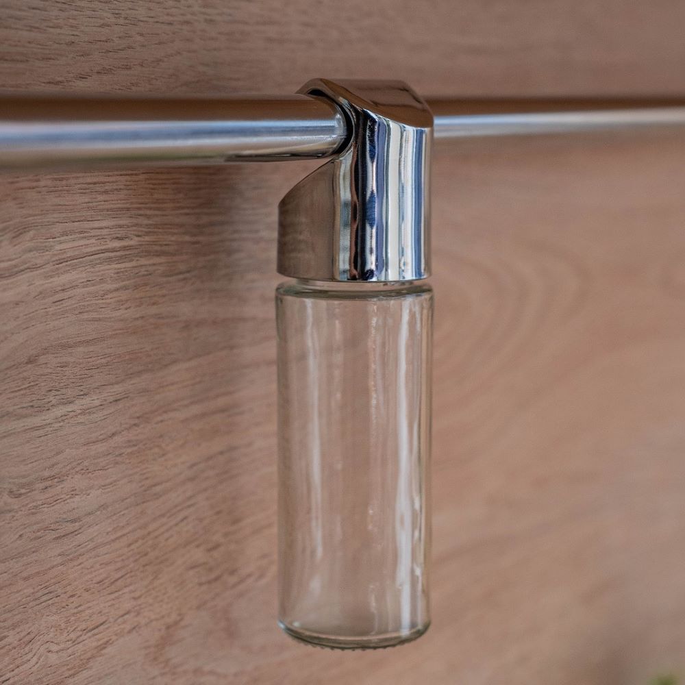 Стеклянная навесная баночка для хранения сыпучих продуктов и специй оснащена специальной крышкой, благодаря которой баночка легко крепится на трубе рейлинга.
