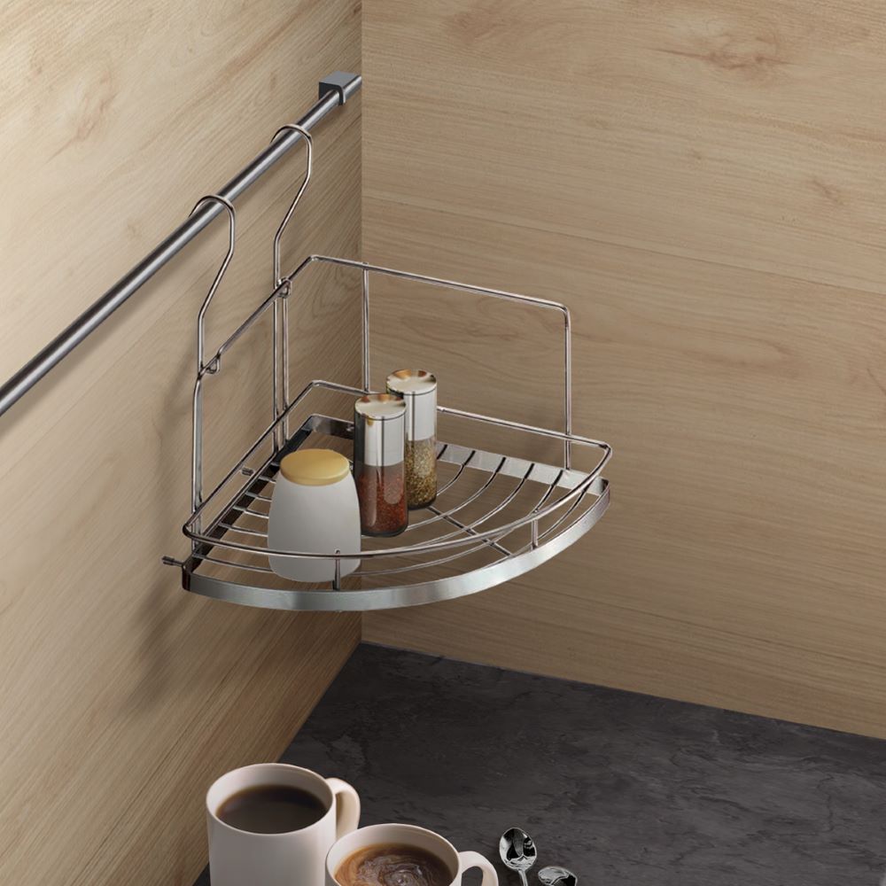Подвесная угловая полка Lemax для рейлинговой системы. Эффективно задействует угловое пространство и позволяет разместить большое количество нужных в хозяйстве аксессуаров и продуктов. Помогает поддерживать порядок на кухне, не загромождая пространство. Выдерживает значительную статическую нагрузку. Специально разработанное покрытие изделия не боится влажности и позволит сохранить идеальный вид на долгие годы.